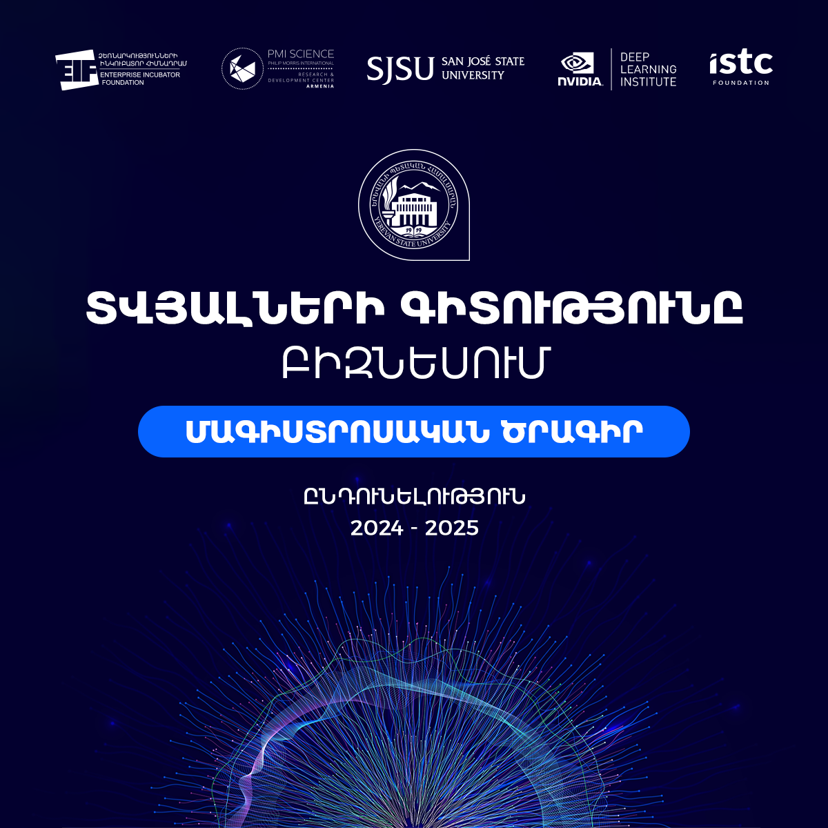 Երևանի պետական համալսարանը (ԵՊՀ) հայտարարում է 2024-2025թթ. ուսումնական տարվա ընդունելություն՝ տնտեսագիտության և կառավարման ֆակուլտետի «Տվյալների գիտությունը բիզնեսում» մագիստրոսական կրթական ծրագրի համար, որն իրականացվում է «Ձեռնարկությունների ինկուբատոր» հիմնադրամի (ՁԻՀ) և Ինովացիոն լուծումների և տեխնոլոգիաների կենտրոնի (ISTC) հետ համագործակցությամբ ու PMI Science գիտահետազոտական կենտրոն Հայաստանի աջակցությամբ։