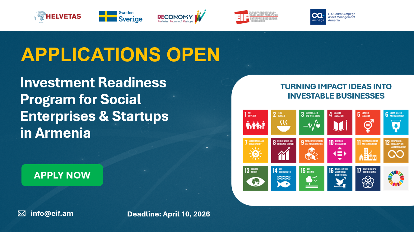 Enterprise Incubator Foundation (EIF) announces the launch of its Impact Acceleration Program designed to identify, accelerate, and invest in early-stage tech startups creating measurable social and environmental impact.  The program is implemented in partnership with C-Quadrat Ampega Asset Management Armenia (CQAA) Social Fund, with the support of the RECONOMY program funded by the Swedish International Development Cooperation Agency (Sida) and implemented by Helvetas Swiss Intercooperation.